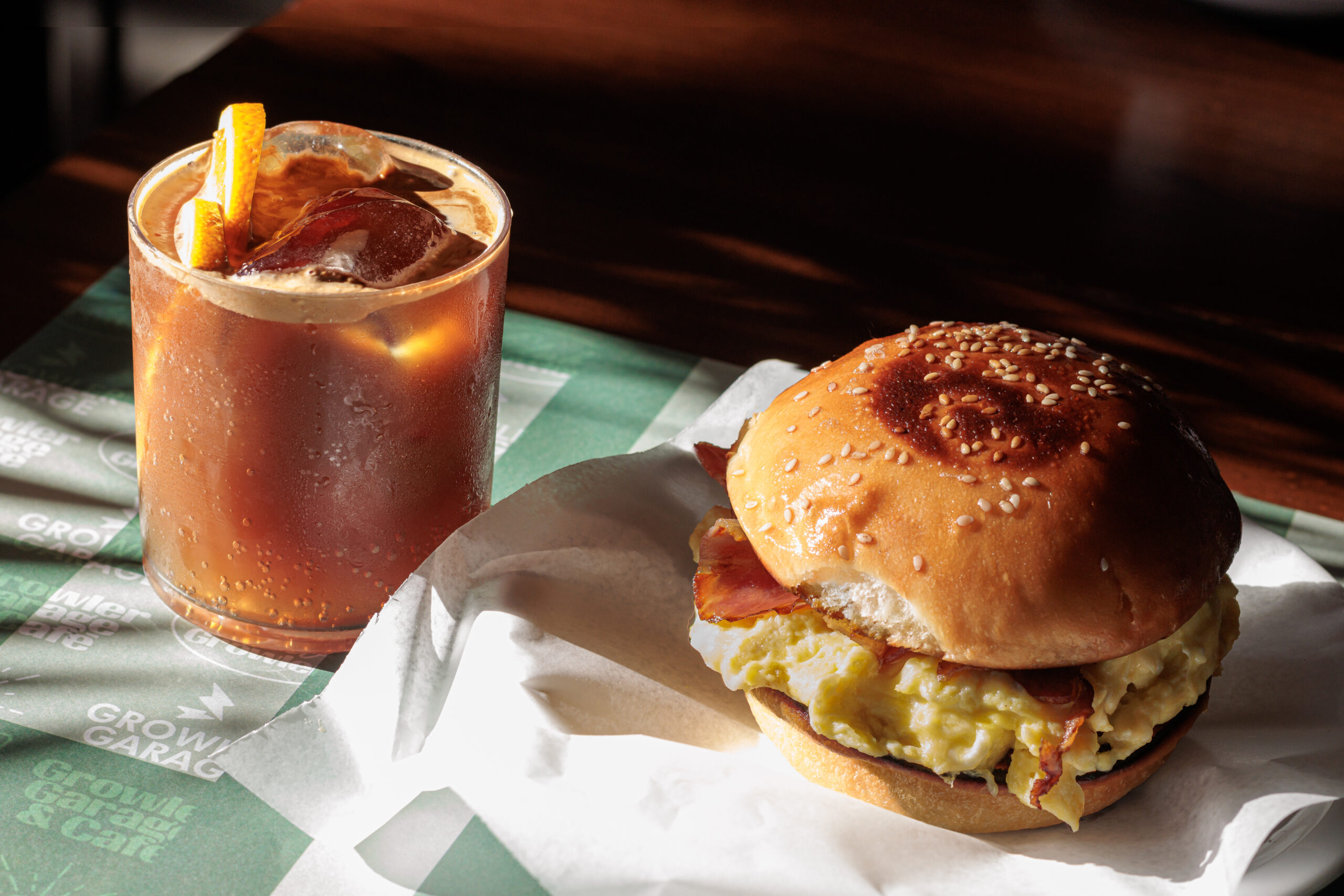 con panceta ahumada, queso, huevos revueltos y manteca en pan de papa